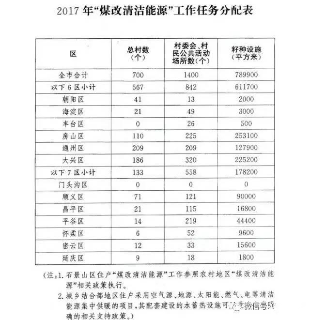 (一)工作目标。2017年10月31日前,完成700个农村地区村庄内住户“煤改清洁能源”任务,同步实施1400个村委会和村民公共活动场所、79万平方米籽种农业设施的“煤改清洁能源”工作,朝阳、海淀、丰台、房山、通州、大兴6个区平原地区村庄内住户基本实现“无煤化”。对未纳入2017年度“煤改清洁能源”计划的村庄,全部实施优质燃煤替代。