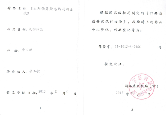 作者唐玉敏先生表示:“我们很荣幸获得浙江省版权局颁发的《太阳能异聚态热利用系统》著作权证书,此项证书说明国家对我们整个研发团队7年来不断进取和追求卓越的工作方式的肯定,系列产品上市推广就获得良好的用户反馈。”