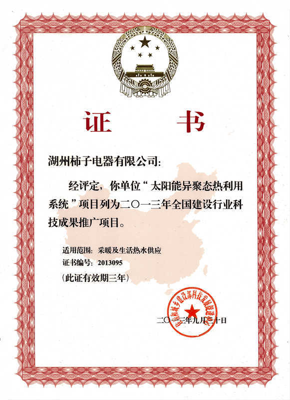 日前,湖州柿子自主研发生产的“太阳能异聚态热利用系统”(以下简称“异聚态系统”)顺利通过了国家科技成果评估,获得2013年“全国建设行业科技成果推广项目”证书,填补了国内太阳能系统采暖的空白。