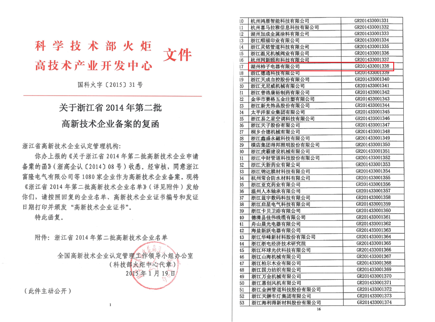 近日,国家科技部公布了“2014年国家火炬计划重点高新技术企业”评选结果,湖州柿子电器有限公司被评定为“国家火炬计划重点高新技术企业”。