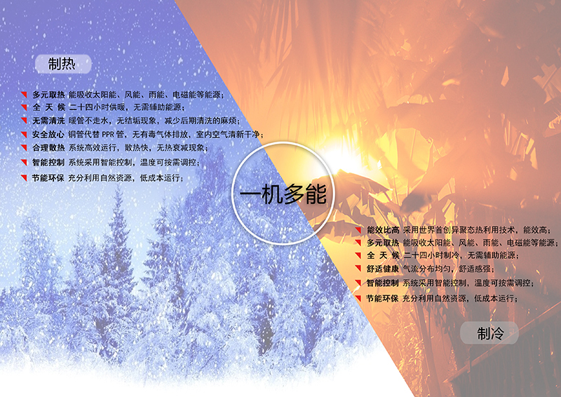 “柿子”自主研发生产销售的“太阳能异聚态热利用系统”有一独特分支应用,冬季采暖、夏季制冷——即太阳能异聚态冷暖系统,是新能源产品的典型代表。太阳能异聚态冷暖系统由聚热板、循环主机、室内散热系统(冬)、室内风机(夏)四部分组成。