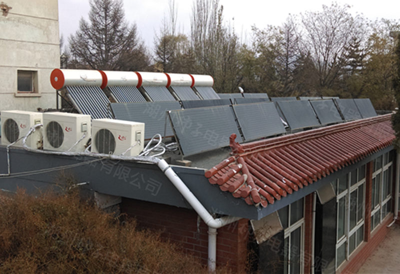 该建设项目位于甘肃省国际太阳能中心基地内,共安装有16块聚热板,每块净集热面积为3.2平方米;循环主机四台并且没有辅助热源,末端采用异聚态散热片。