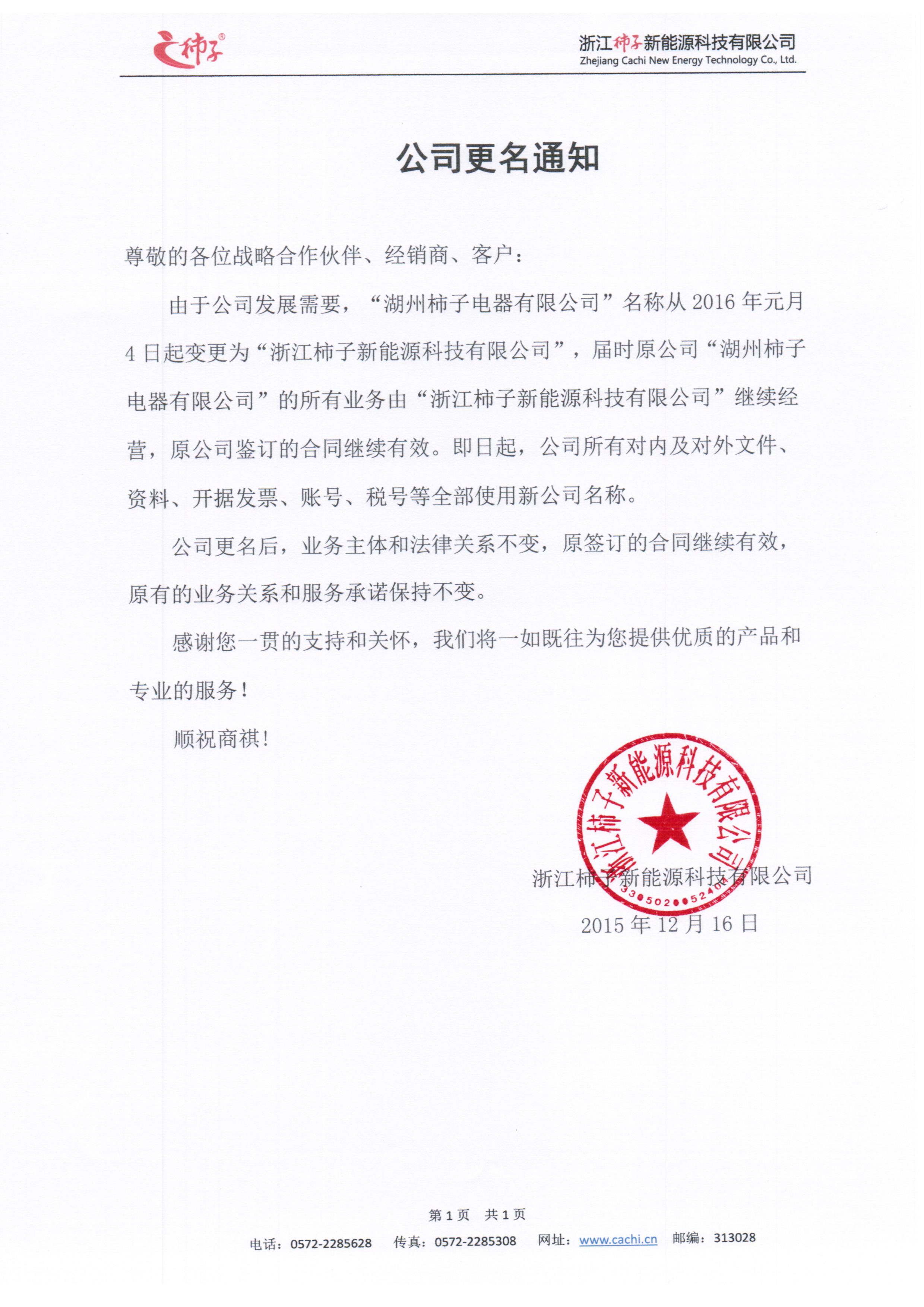 由于公司发展需要,“湖州柿子电器有限公司”名称从2016年1月4日起变更为“浙江柿子新能源科技有限公司”,届时原公司“湖州柿子电器有限公司”的所有业务由“浙江柿子新能源科技有限公司”继续经营,原公司鉴订的合同继续有效。即日起,公司所有对内及对外文件、资料、开据发票、账号、税号等全部使用新公司名称。