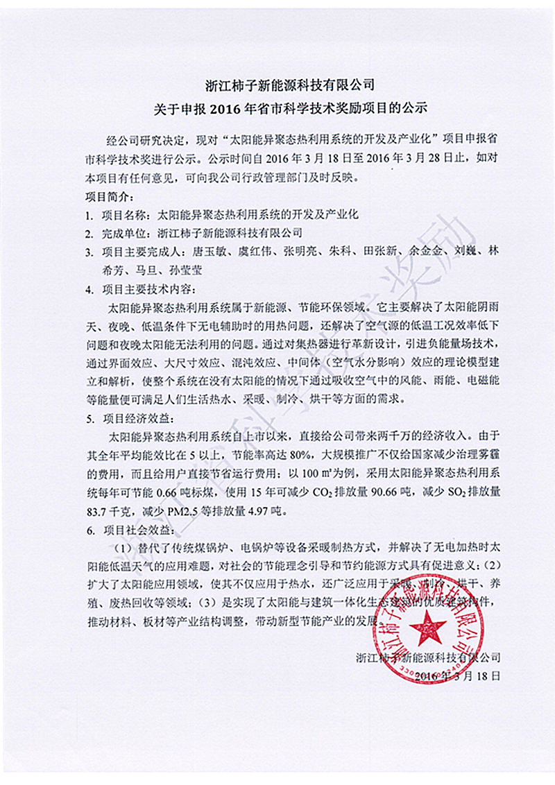 柿子新能源关于申报2016年浙江省科技项目的公示