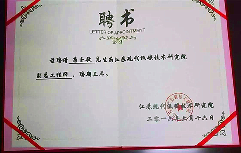2016年6月16日,柿子新能源总经理唐玉敏先生获任江苏现代低碳技术研究院副总工程师,由原江苏省科技厅副厅长史苑芗及江苏现代低碳技术研究院院长徐拥军颁发聘书。