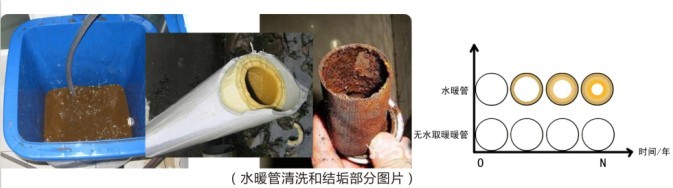 针对上图出现的问题,我们从无水取暖的角度进行创新设计,从根本上阻断了暖管结垢发生的可能性。使用无水取暖系统,不用再担心随着时间的增长,水暖管结垢导致热衰减现象的发生。同时,管道不会结垢也省去了定期清洗的大麻烦。使用无水取暖系统,真正做到一次安装终生受用。水暖管随着时间的推移,内部水垢越来越厚,向周围散发的热量越来越少效率越来越差,结果是消耗很多能量但是房间里面依旧不暖和。最终必将选择暖管洗或重装。耗时耗资工程繁琐,更重要的是会对装修造成严重的破坏。相反地无水取暖暖管不会发生内壁结垢现象!