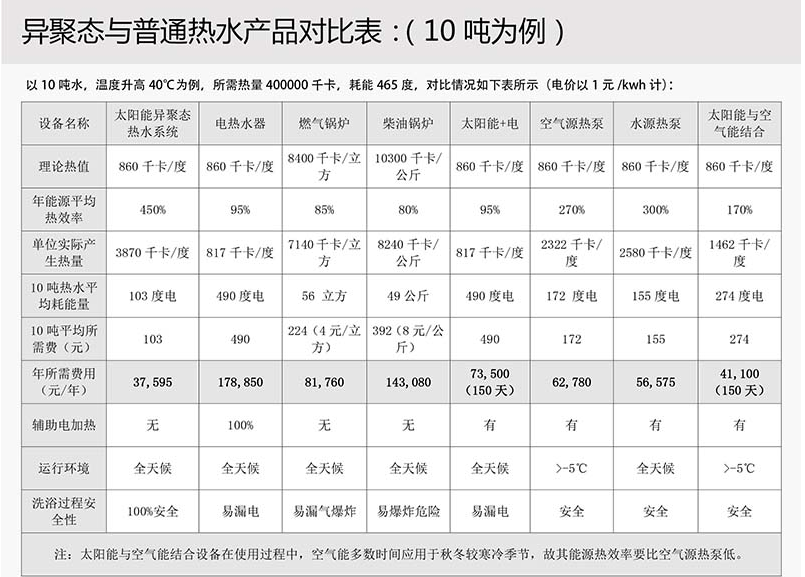 5.太阳能异聚态集热板是最安全的集热板,冰雹沙尘暴等天气因素不会造成集热板破损,而玻璃管太阳能可能会出现爆管炸管等安全维护问题。夏季高温暴晒也不会造成系统安全问题,停机状态集热板与周围环境温度等同,可以自然发生热交换;