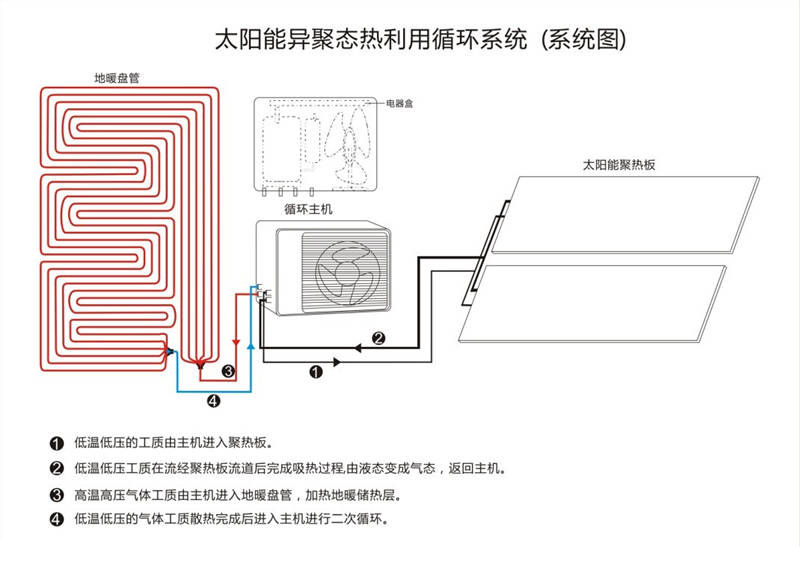 太阳能异聚态无水取暖由集热板,主机和铜管构成。与传统太阳能集热器不同,它的集热率经过专业机构检测高达135%,因此一个一百平方米的采暖面积只需要4块集热板。集热板是由金属压制而成,只有8kg重3mm厚,可以轻松的安装在阳台外墙或者窗户以下的墙面,随层安装解决了高层建筑住户多顶层空间少的矛盾。采暖主机根据采暖需求配置,让有限的安装空间达到规定采暖效果成为现实。地面管路使用毛细铜管,通过气体工质循环来完成采暖,金属管路不会随着时间推移释放有毒物质危害用户健康。