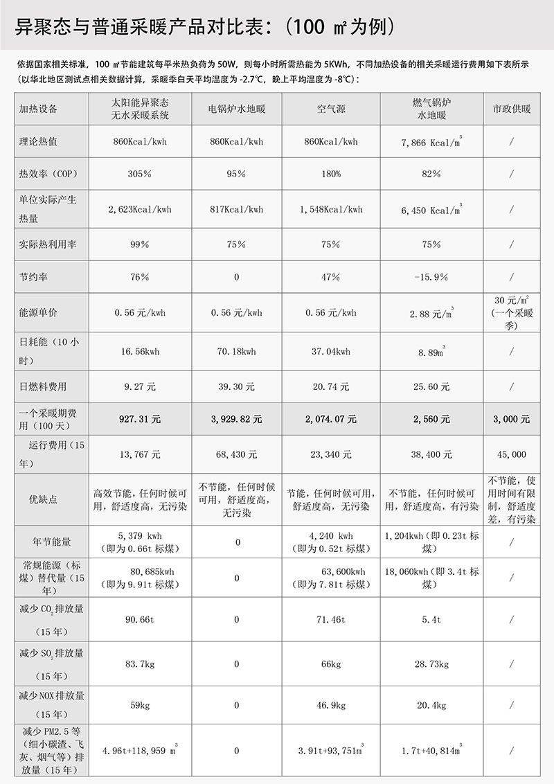 太阳能异聚态集热板在有阳光的时候可以完全吸收太阳辐射,在没有太阳时又可以从风能和雨能等环境能源中吸收能量,这就提升了太阳能异聚态无水取暖的采暖效果,不再局限于天气影响。系统内去除了辅助能源,是对技术和产品性能的严苛考验。系统默认设置采暖室温为17℃(可以按需提供更高的室内温度),在哈尔滨、青海、内蒙古、宁夏、西宁、兰州、西安等地的用户反馈,均达到了目标温度,非常节能省钱。